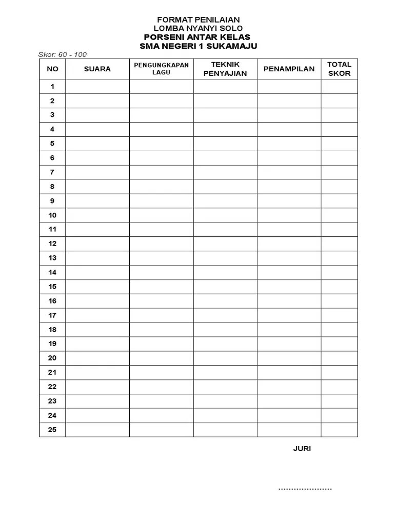 Penilaian juri mutlak, tidak bisa diganggu gugat. Festival lomba seni siswa nasional (fls2n) · format penilaian di bidang lomba solo song · no. 1 registrasi peserta dan pengiriman karya. Format penilaian di bidang lomba solo song (fls2n). Nama peserta bidang penilaian jumlah ket.